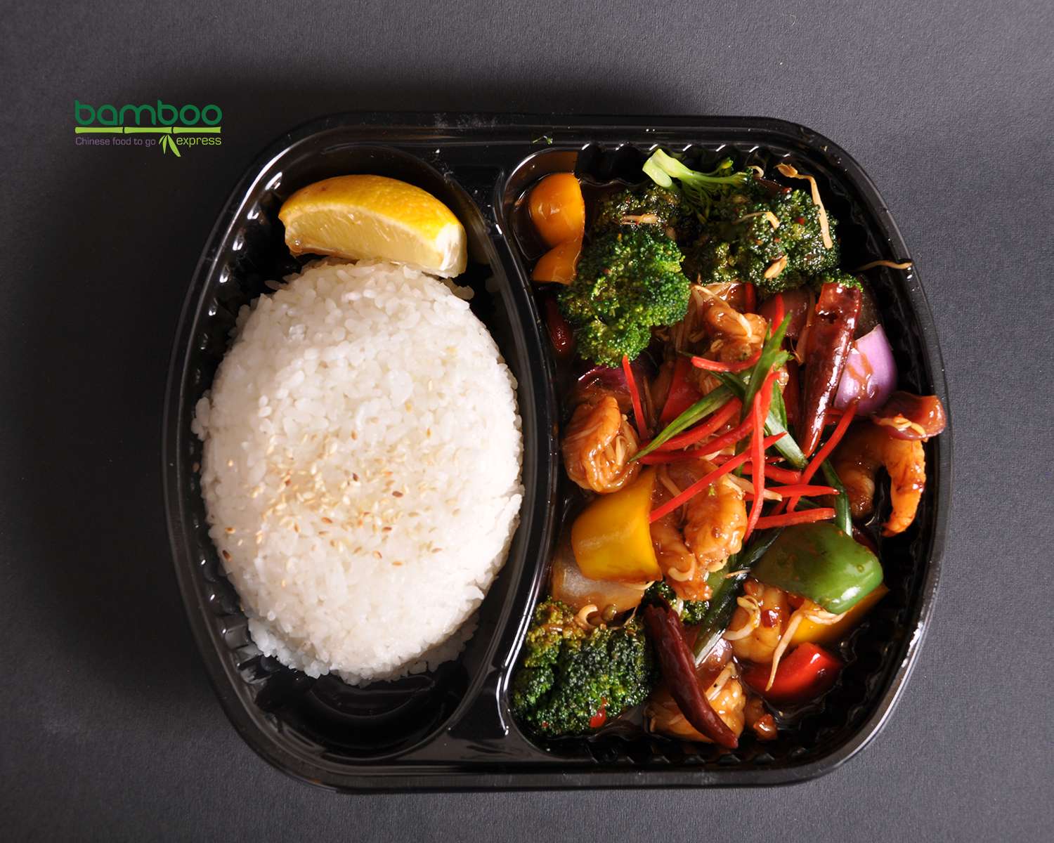 میگو تفت داده شده در آتش به همراه سس تند فایرکراکر با فلفل دلمه ای، براکلی ، پیازچه ، لیمو و برنج بخارپز