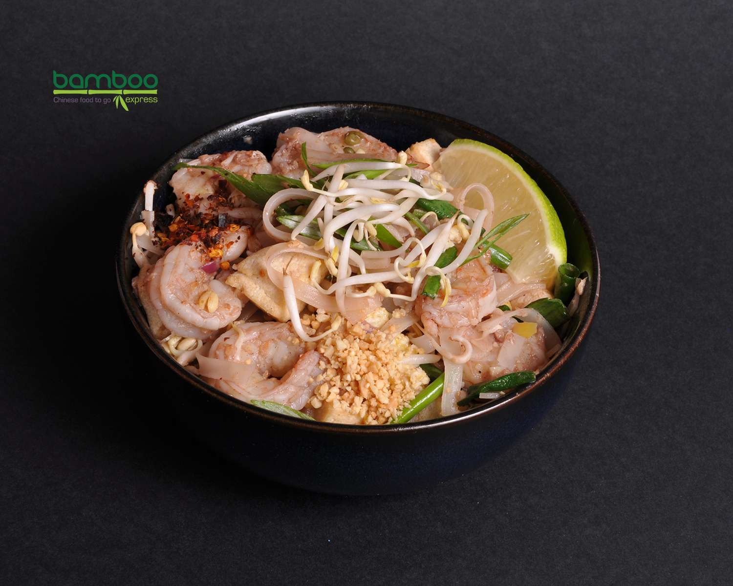 نودل برنج با سس پدتای، میگو، جوانه، پیازچه، بادام زمینی وپنیر توفو