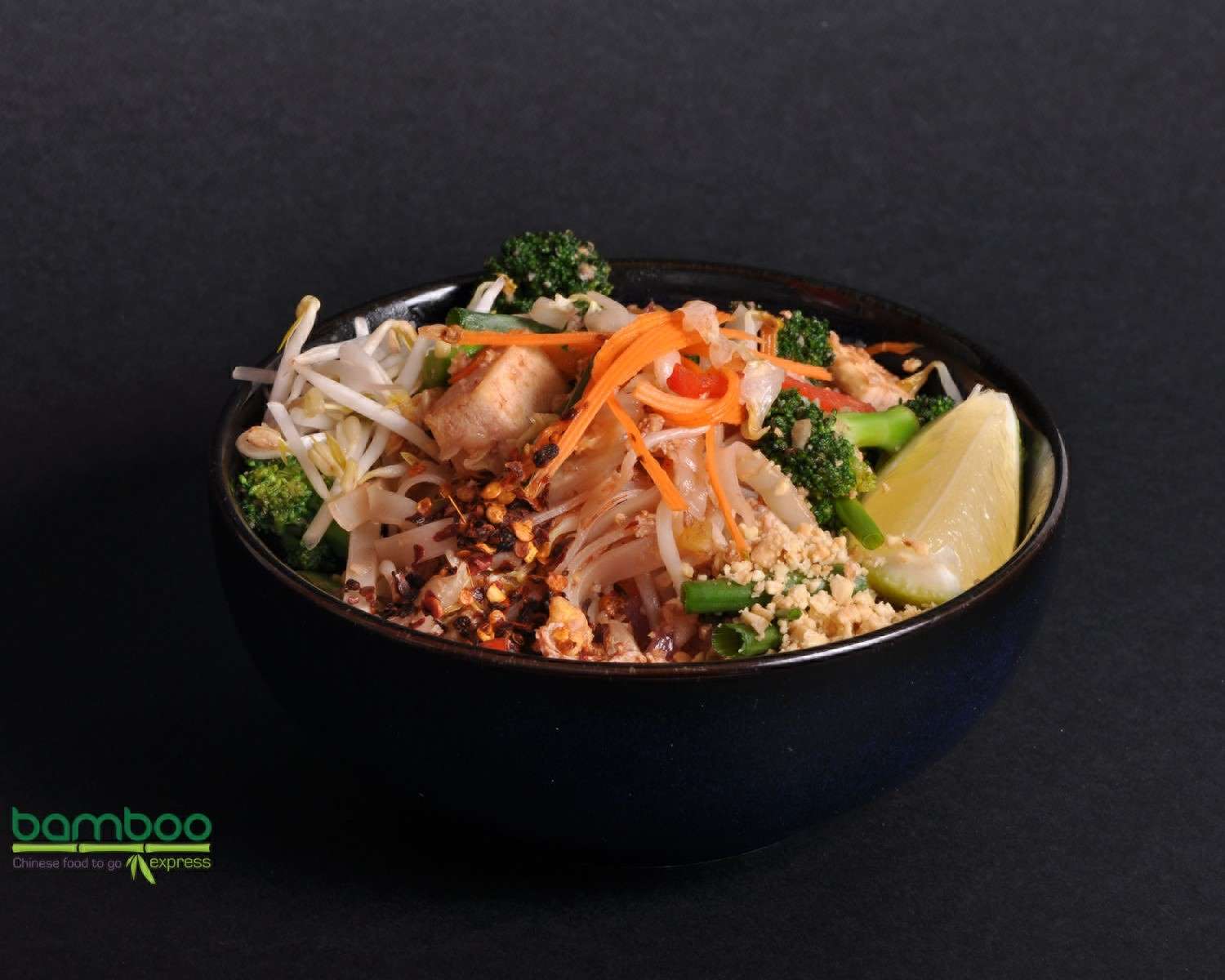 نودل برنج با سس پدتای، جوانه، پیازچه، هویج، فلفل دلمه ای، کلم چینی، بادام زمینی و پنیر توفو